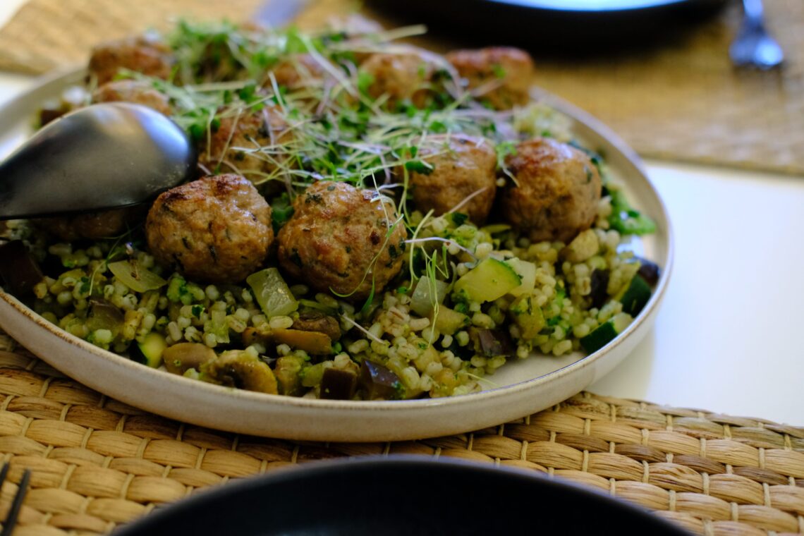 Kjøttboller er så godt, og de kan varieres med ulike kjøtt typer, urter, krydder og tilbehør. Her har jeg noen som er servert med byggris og grønnsaker.