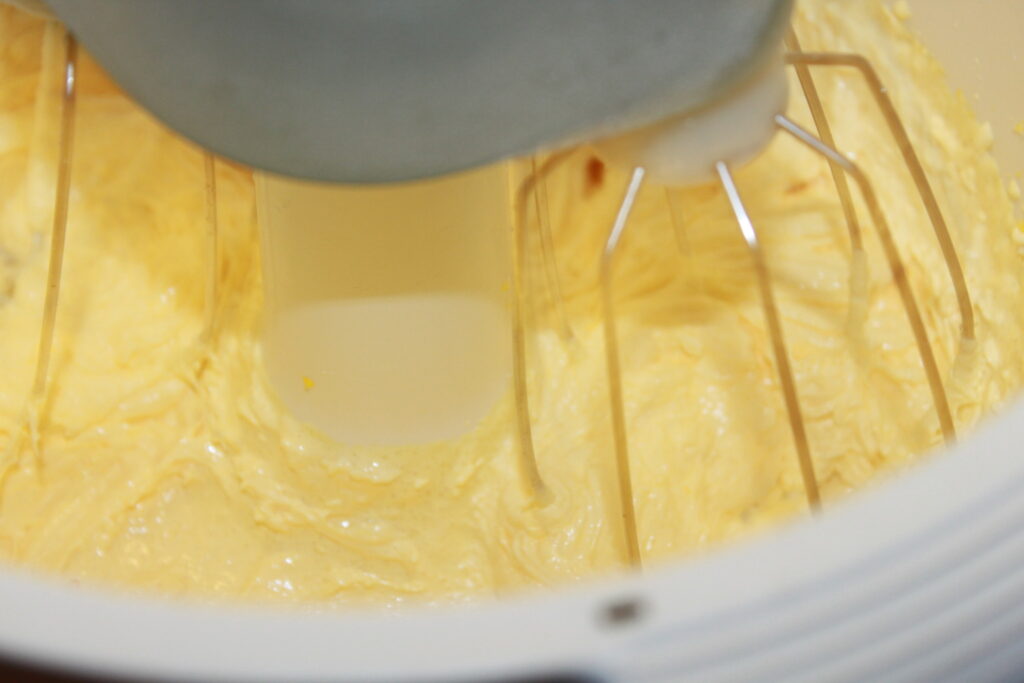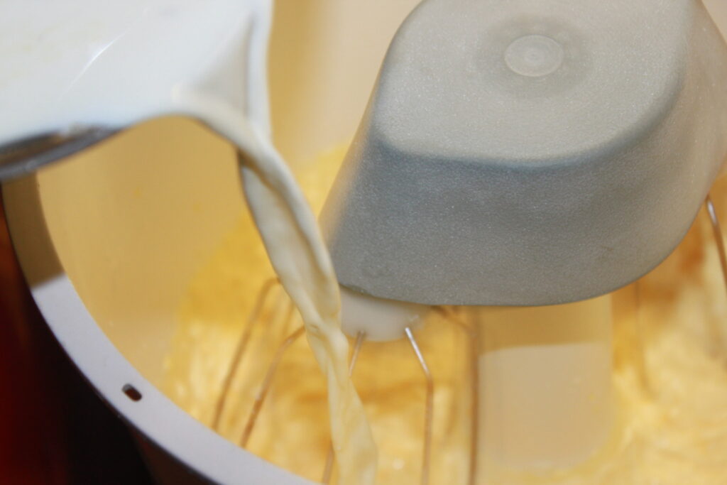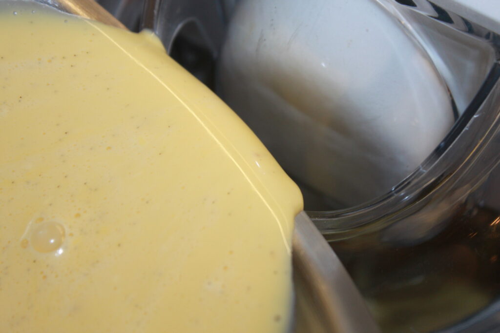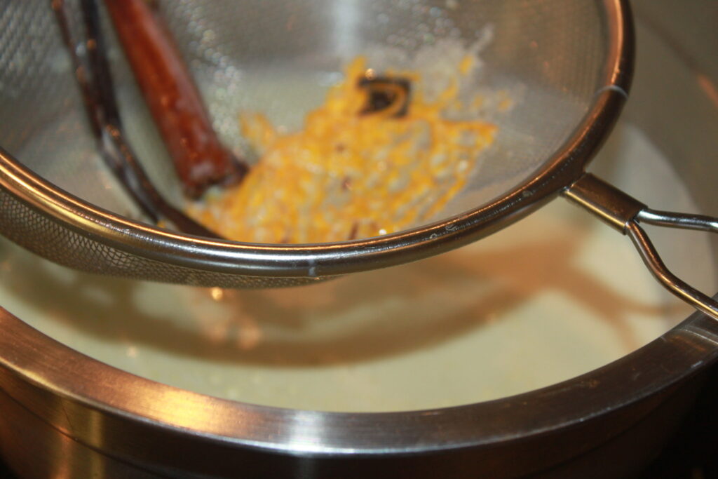 Pisk eggeplommer og sukker til eggedosis. Ta vanilje og kanelstang ut av gryta, og tilsett melkeblandingen i eggedosisen under omrøring.