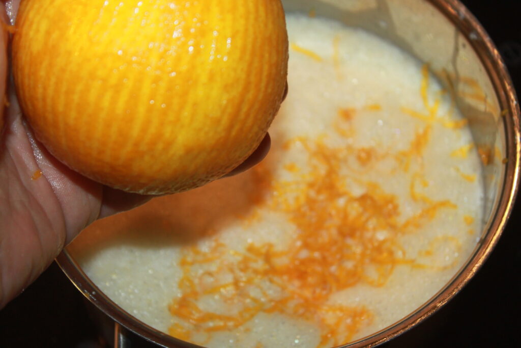 Ha blandingen tilbake i gryta, tilsett cest fra en appelsin og ha over vanilje og kanelstangen igjen.