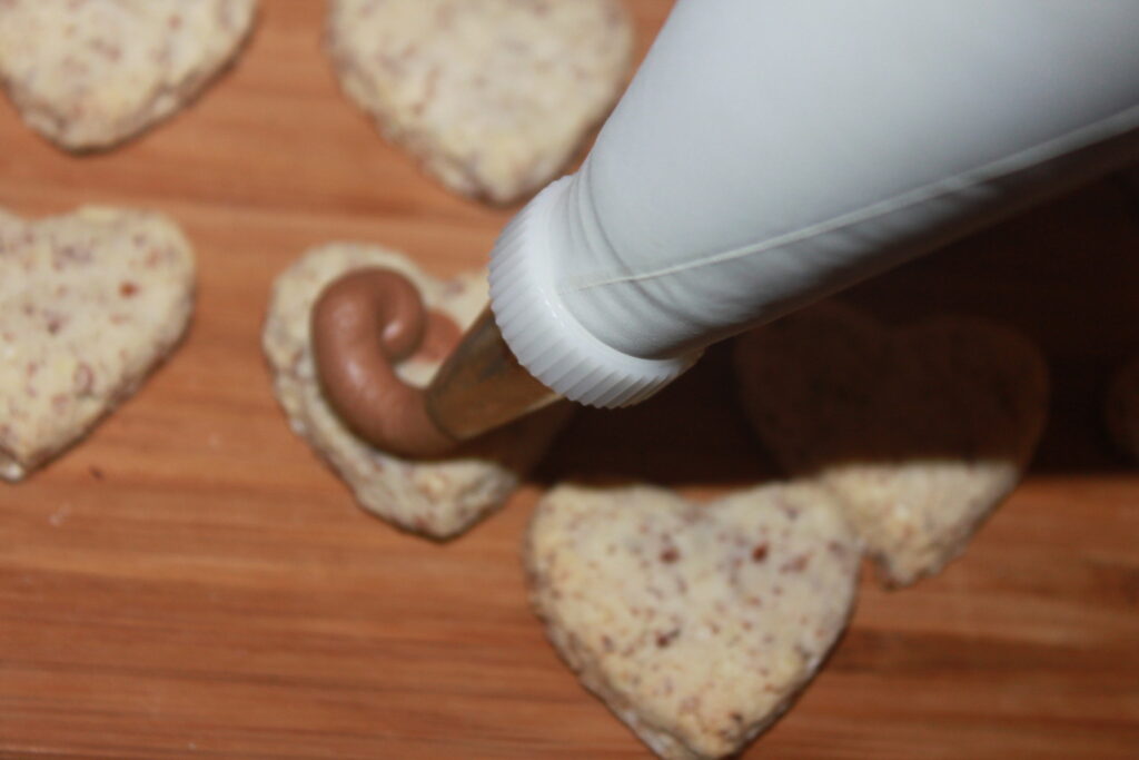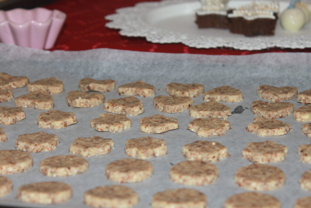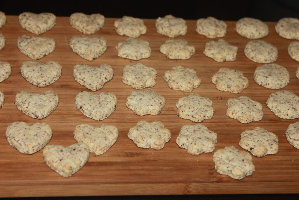 Rull ut kransekakemassen og trykk ut småkaker med en utstikker. Jeg synes det er fint med ulik fasong på de, her har jeg brukt både rund, hjerte og blomst utstikker.