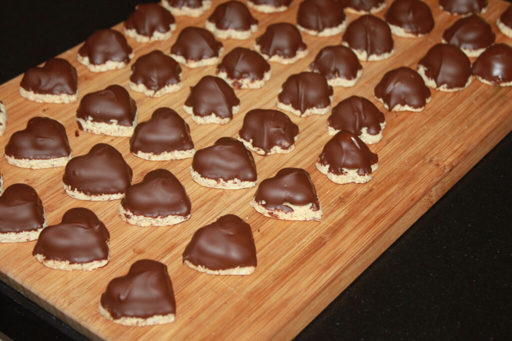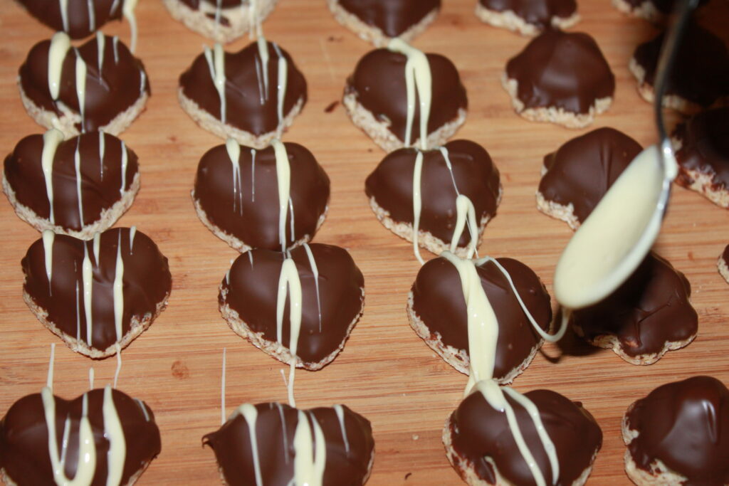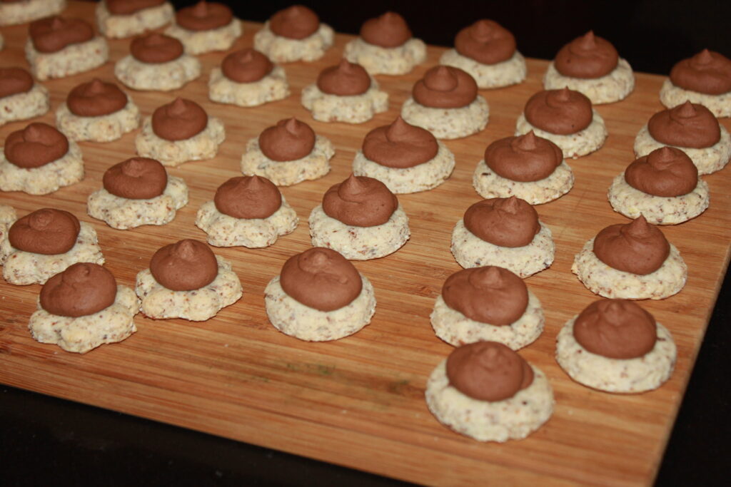 Ha den lett piskede trøffelkremen i en sprøytepose og sprøyt ut små topper på småkakene.