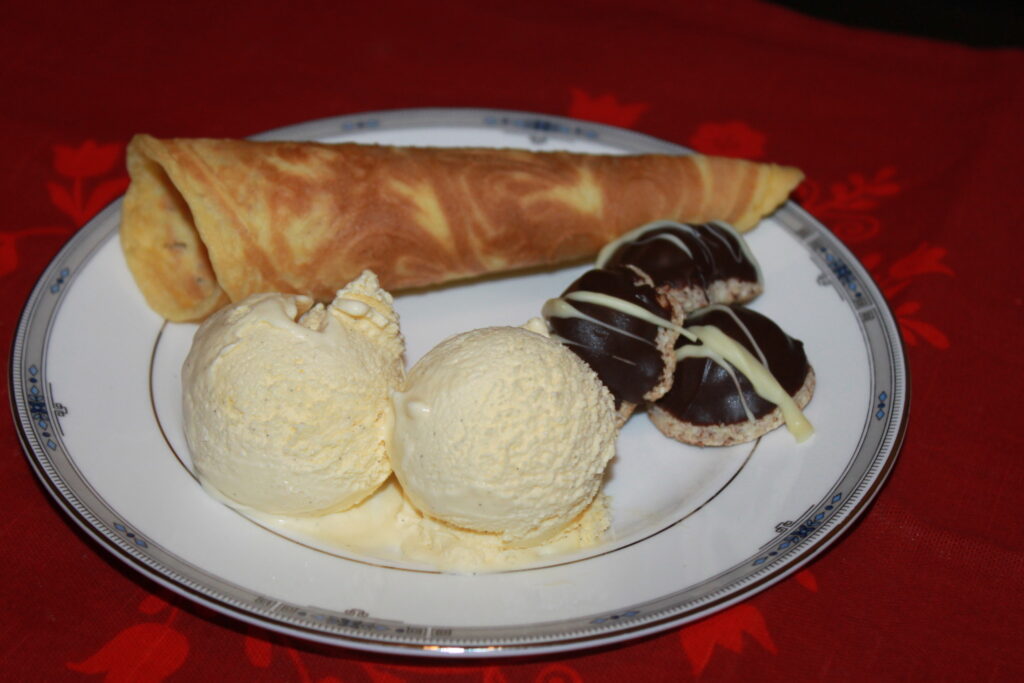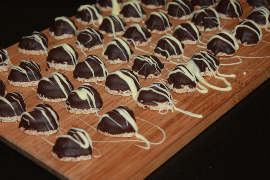 Til slutt sprinkles litt hvir sjokolade over. Oppbevar i tett boks i kjøleskap eller fryser. Server gjerne med hjemmelaget is. Lykke til!