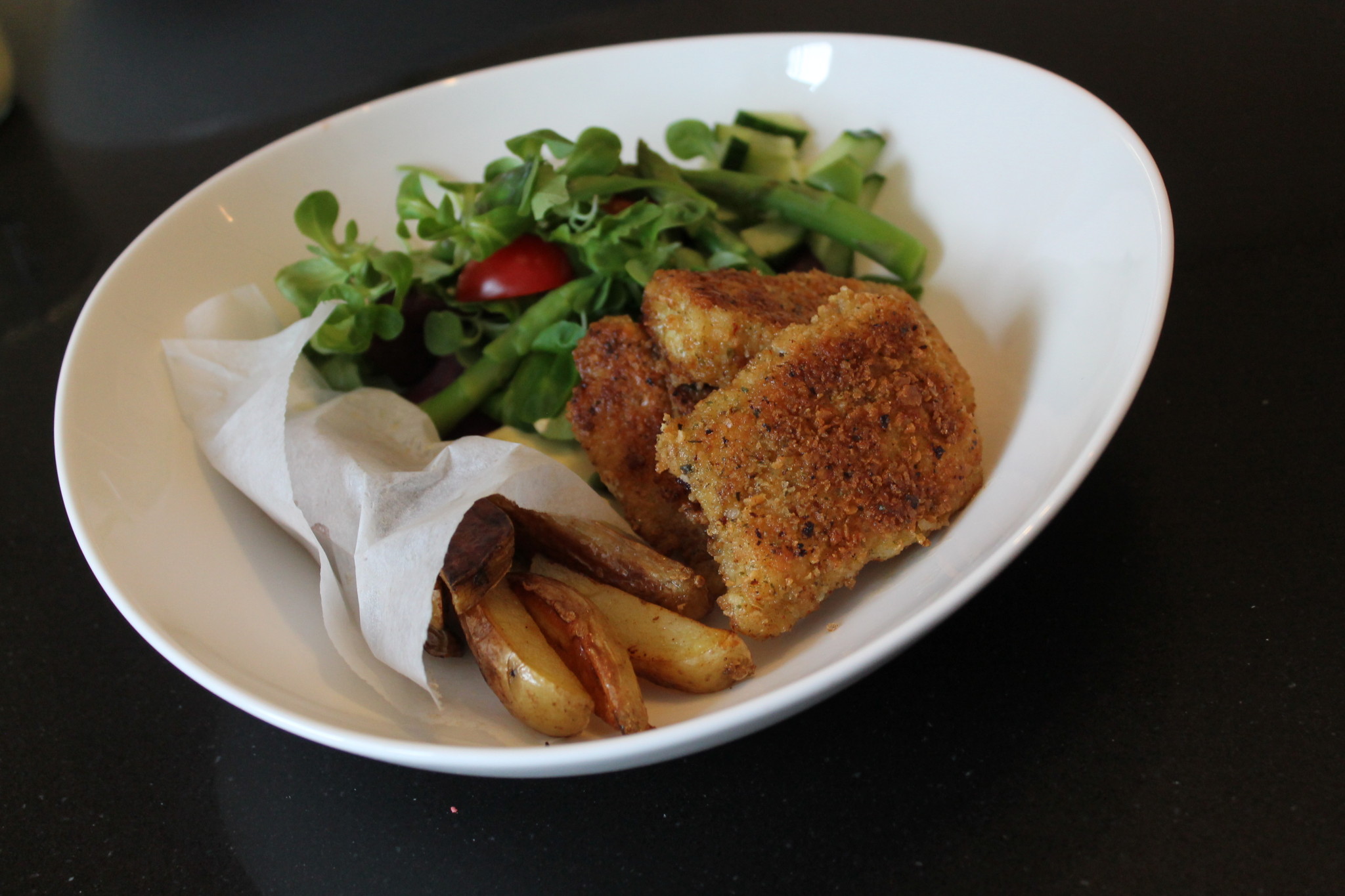 Fiskepinner med stekte poteter, frisk salat og remulade