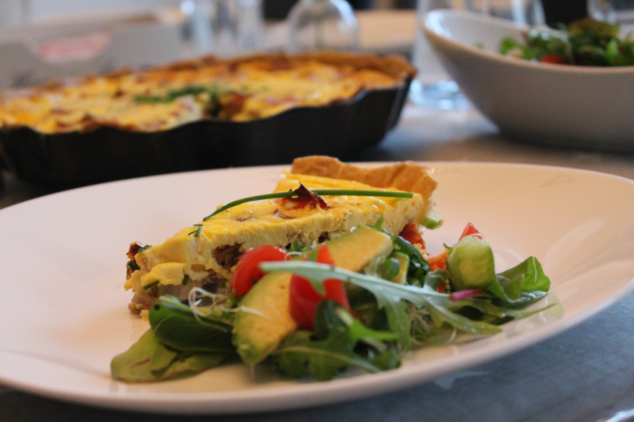 Server med lun kyllingfilet, sprøstekt bacon, pesto, urtedressing og masse grønnsaker.