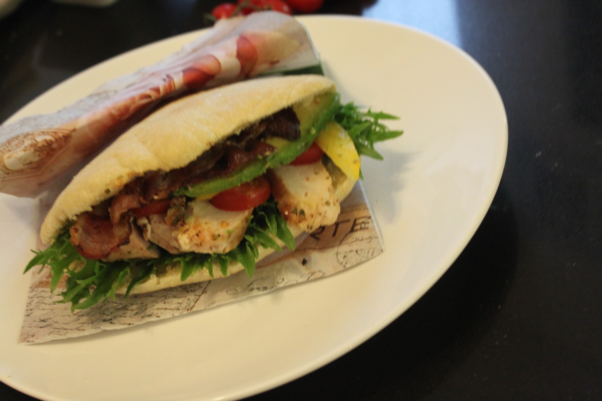Helg og fredagskveld. Nybakt pitabrød, lun kylling, sprøstekt bacon, pesto, urtedressing og masse grønnsaker. Kan det bli bedre?