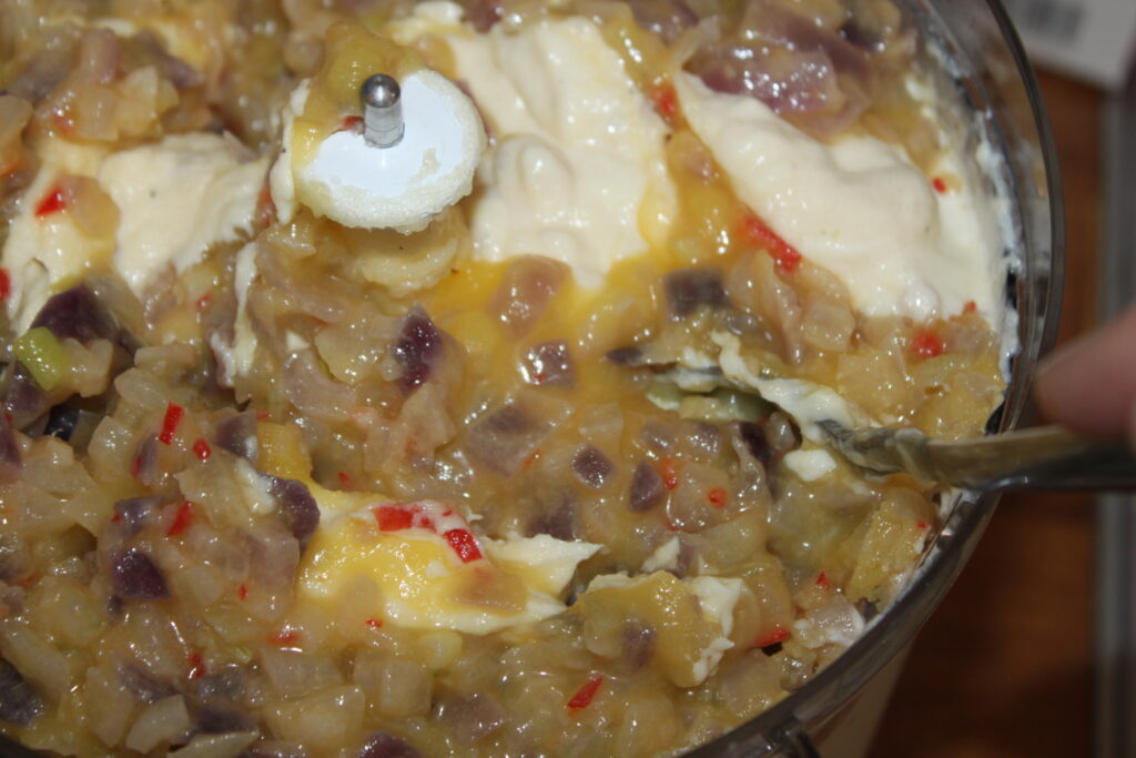 Så skal avkjølt løk, hvitløk, chili og smør tilsettes. Ha det over og vend forsiktig inn.