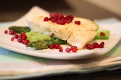 Server med godt tilbehør. Jeg valgte blomkålpurè, gulrot og aspargesbønner.