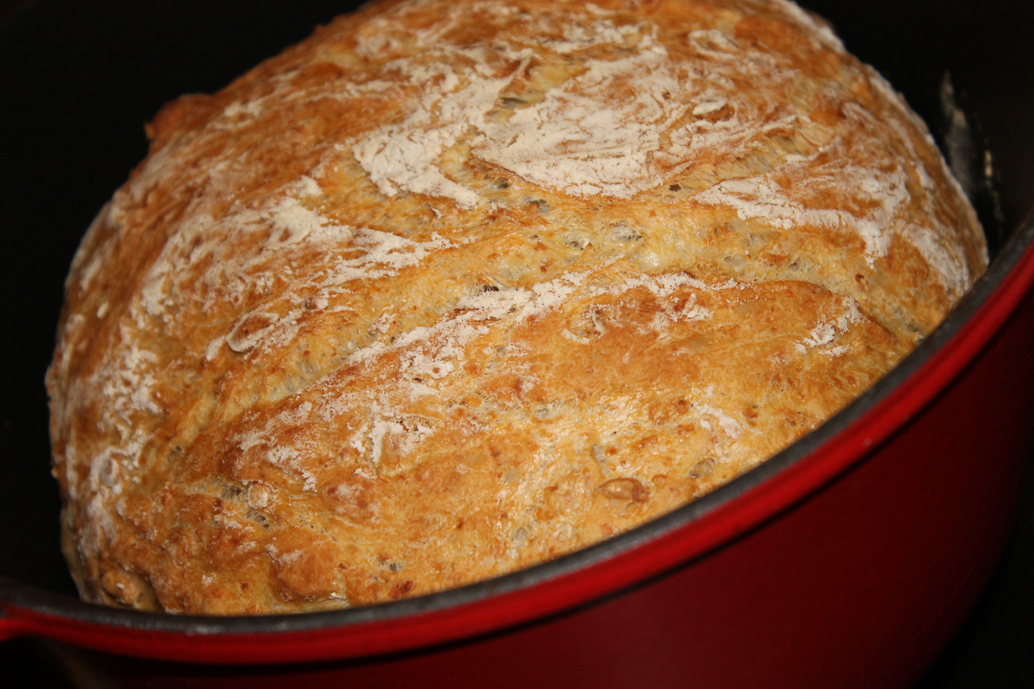 La den stå uten lokk/plast og la den avklimatisere seg 1/2 time før du igjen har plast over og lar den stå ytterligere 1-1 1/2 time, du må gjerne strekke og brette en gang til, etter 40 minutter. Ha så deigen over på melet bakebord og strekk og brett en siste gang. La deigen hvile en time. Etter 30 minutter, sett ei støpejernsgrte (ca 4 liter) i kald ovn, sett ovnen på 250 grader. Etter ytterligere 30 minutter tar du gryten ut av ovnen, ha brødet forsiktig over i gryta, med skjøten ned, ha over lokk og sett det i ovnen. Skru ned temperaturen til 220 grader, stek 30 minutter, ta av lokket og stek 15 minutter til. La brødet avkjøle på rist. Ikke skjær i det før det har avkjølt seg en times tid.