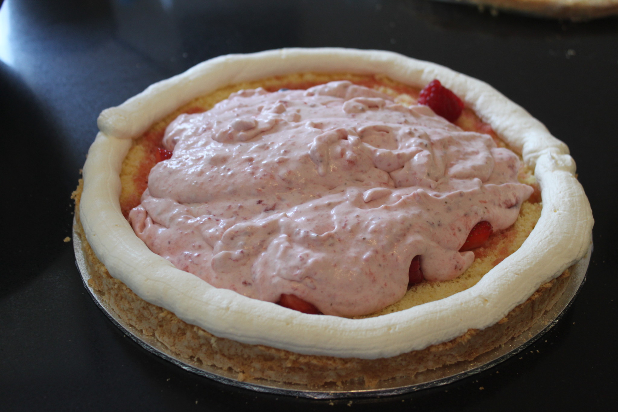 Legg nederste lag på et kakefat eller brett, dynk kakebunnen og pisk krem trenger ca 5 dl, ikke pisk den for stiv. Jeg pisker kremen, tar av halvparten og tilsetter litt sukker i resten. Fyll kremen som er uten sukker i en sprøytepose og lag en dik rundt kanten. Legg på friske bær og så et lag jordbærfromasj i det nederste laget. Oppskrift her.