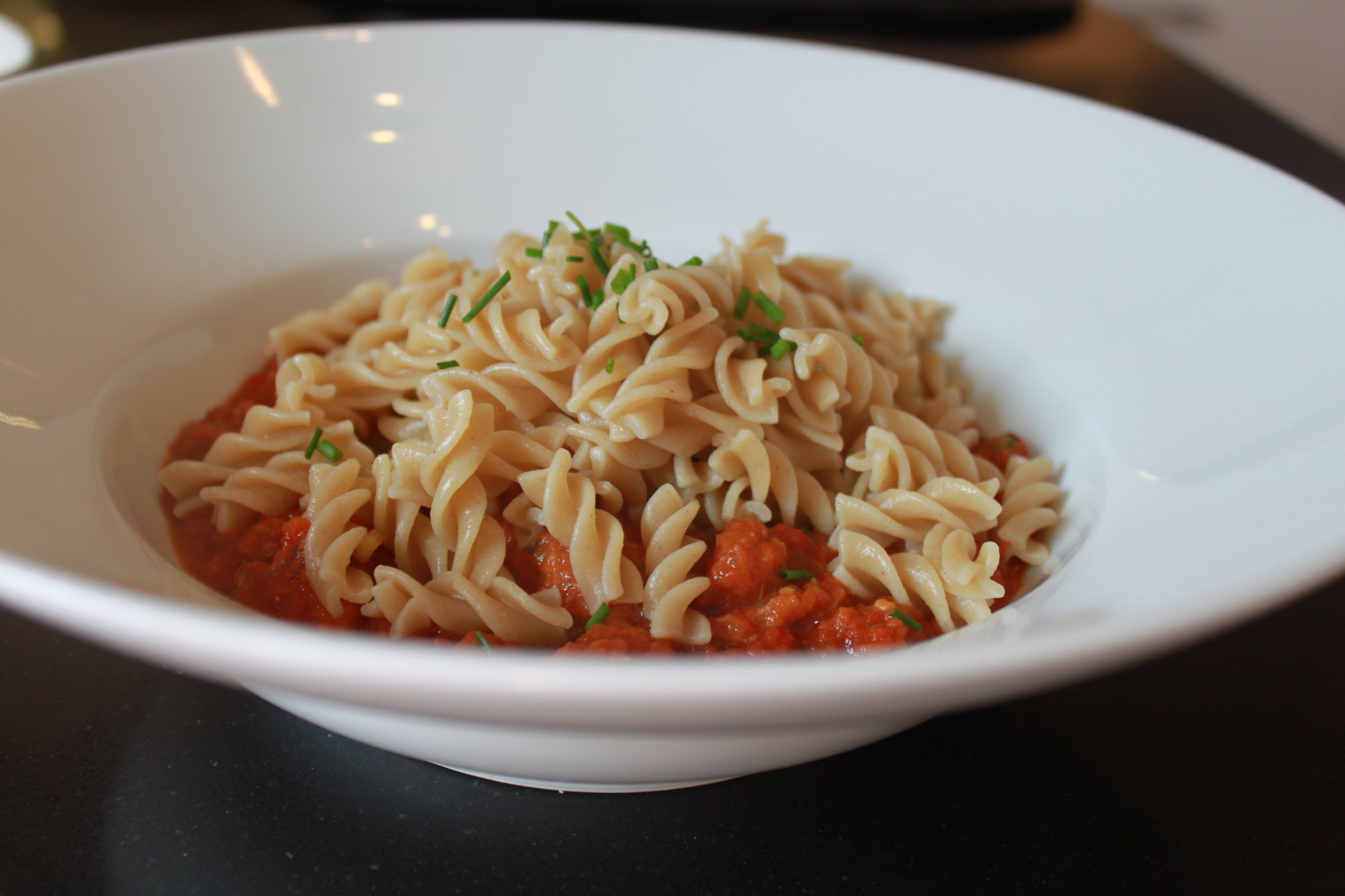 Server med nykokt fullkornspasta, frisk gressløk og et dryss parmesan.