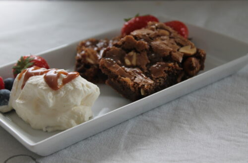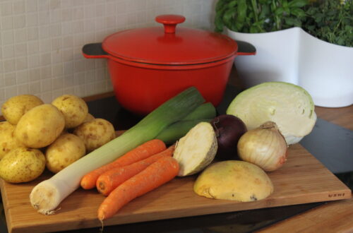 Hakk opp grønnsakene i ønskede biter og bland det hele sammen, ha over litt ringblomst og server gjerne sammen med litt ristede pinjekjerner.