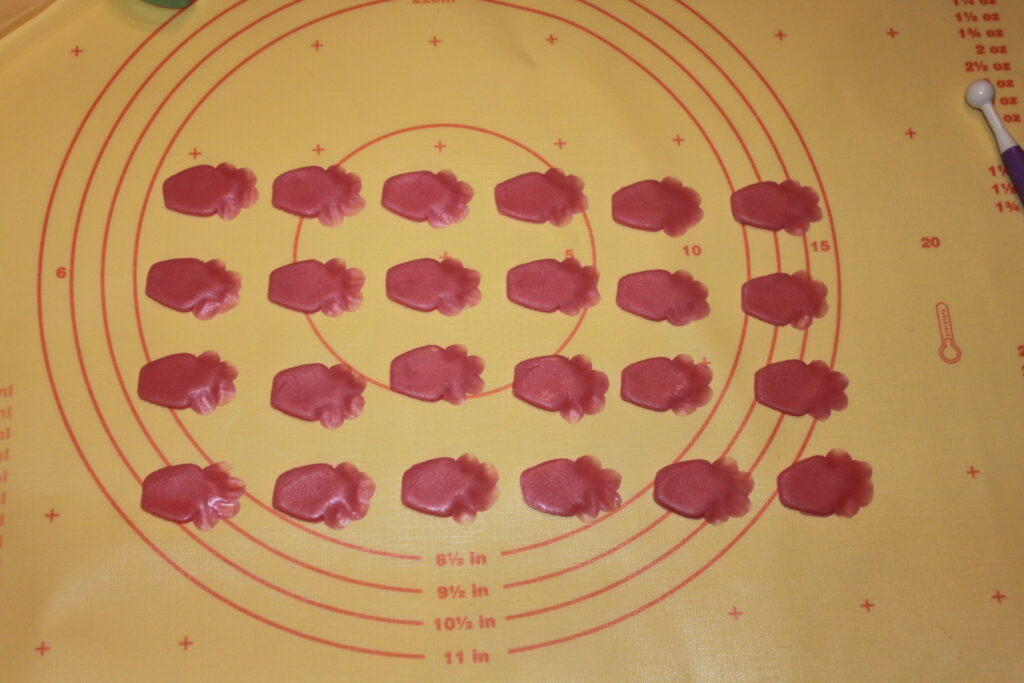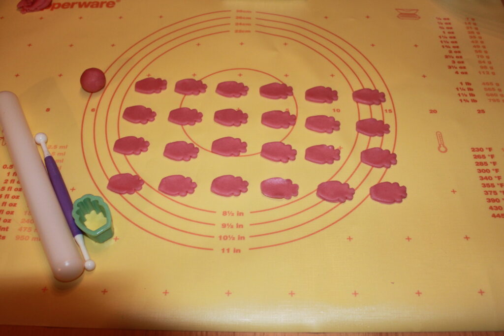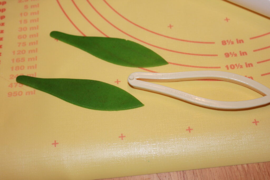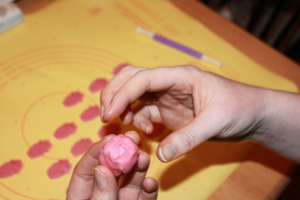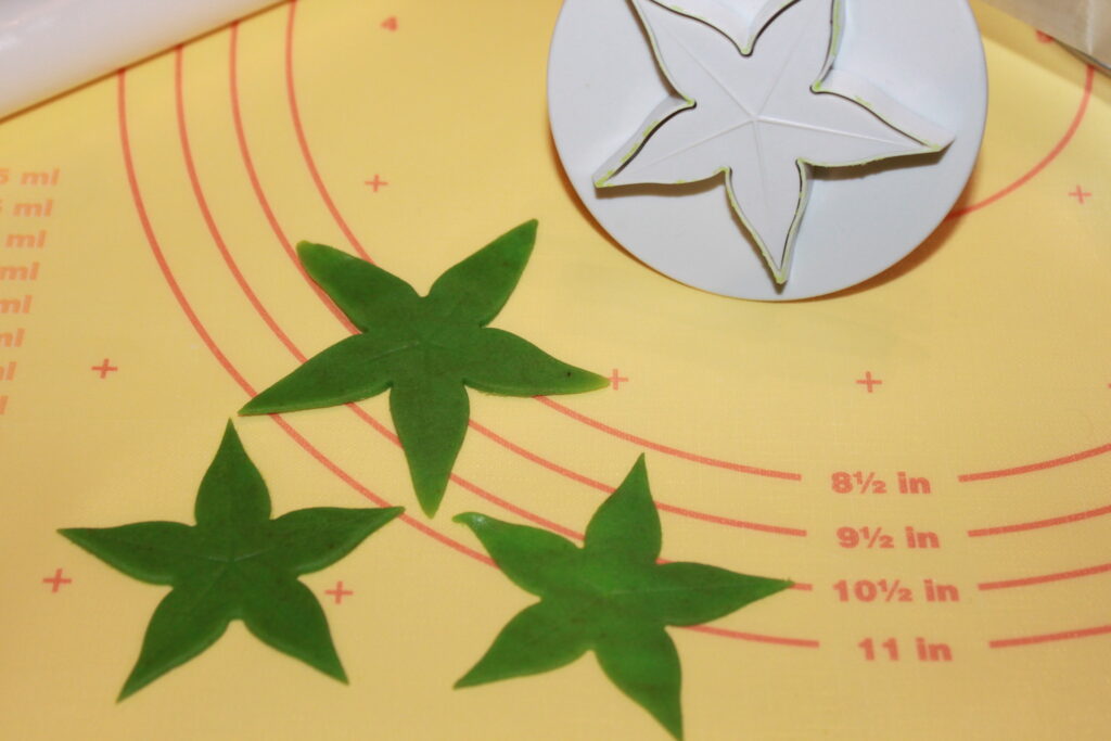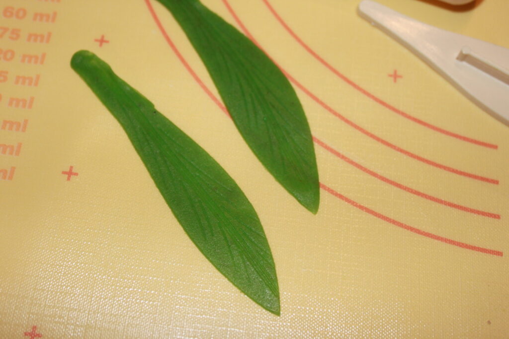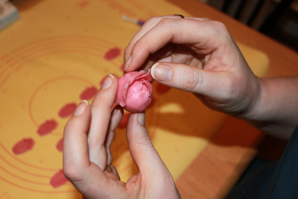Kronbladene bør dekkes med plast så de ikke tørker ut. Her har jeg marsipan fra Funcakes, den tåler litt mer og er veldig god til modellering.