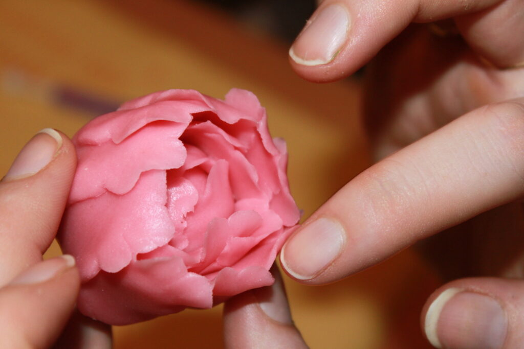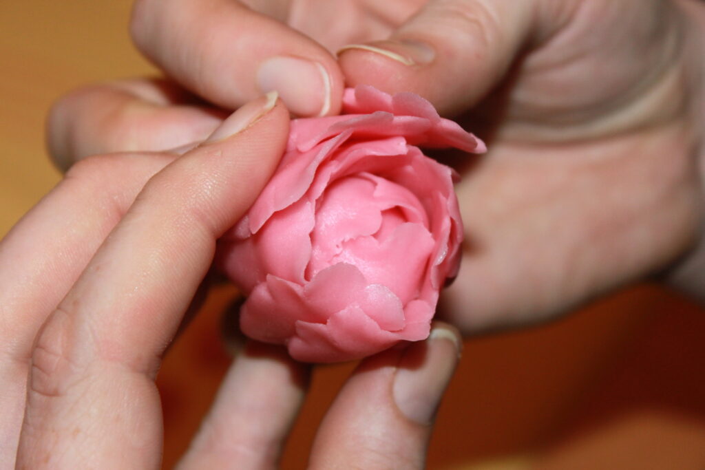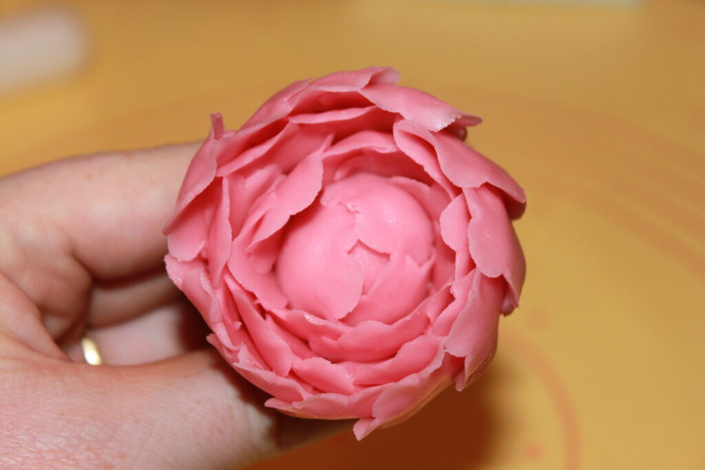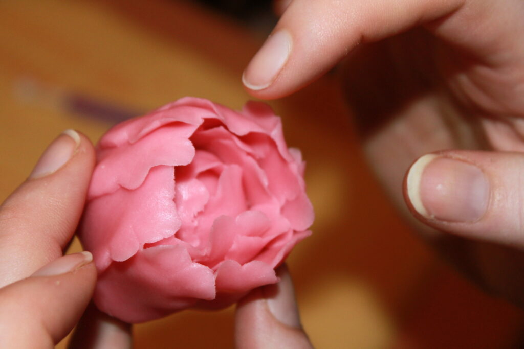Her overlappes det siste kronbladet under det første. Se bilde. Du kan bruke peonen slik den er nå, eller du kan legge på mer kronblader. Jeg liker å ha litt forskjellige størrelser på peonene.
