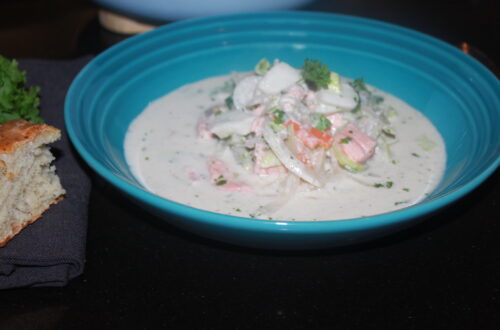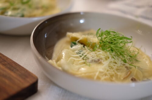 Tilsett hvitløk og rømme, press over litt sitron.