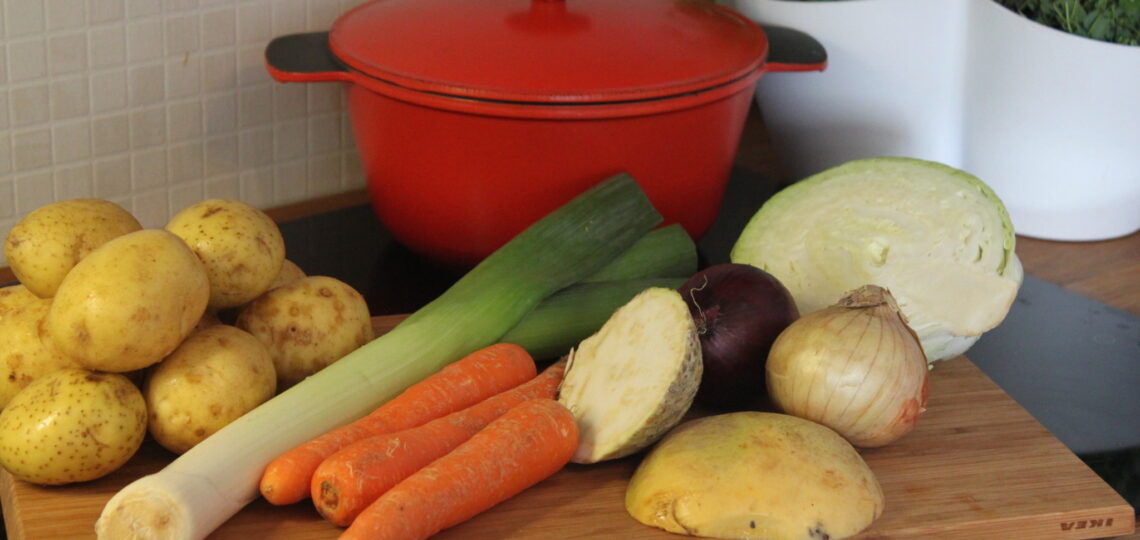 Pannestekt skrei med potetmos, bacon og ovnsbakte grønnsaker