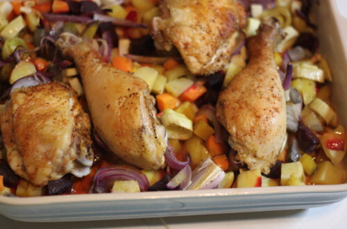 Ovnsbakte kyllinglår med rotgrønnsaker